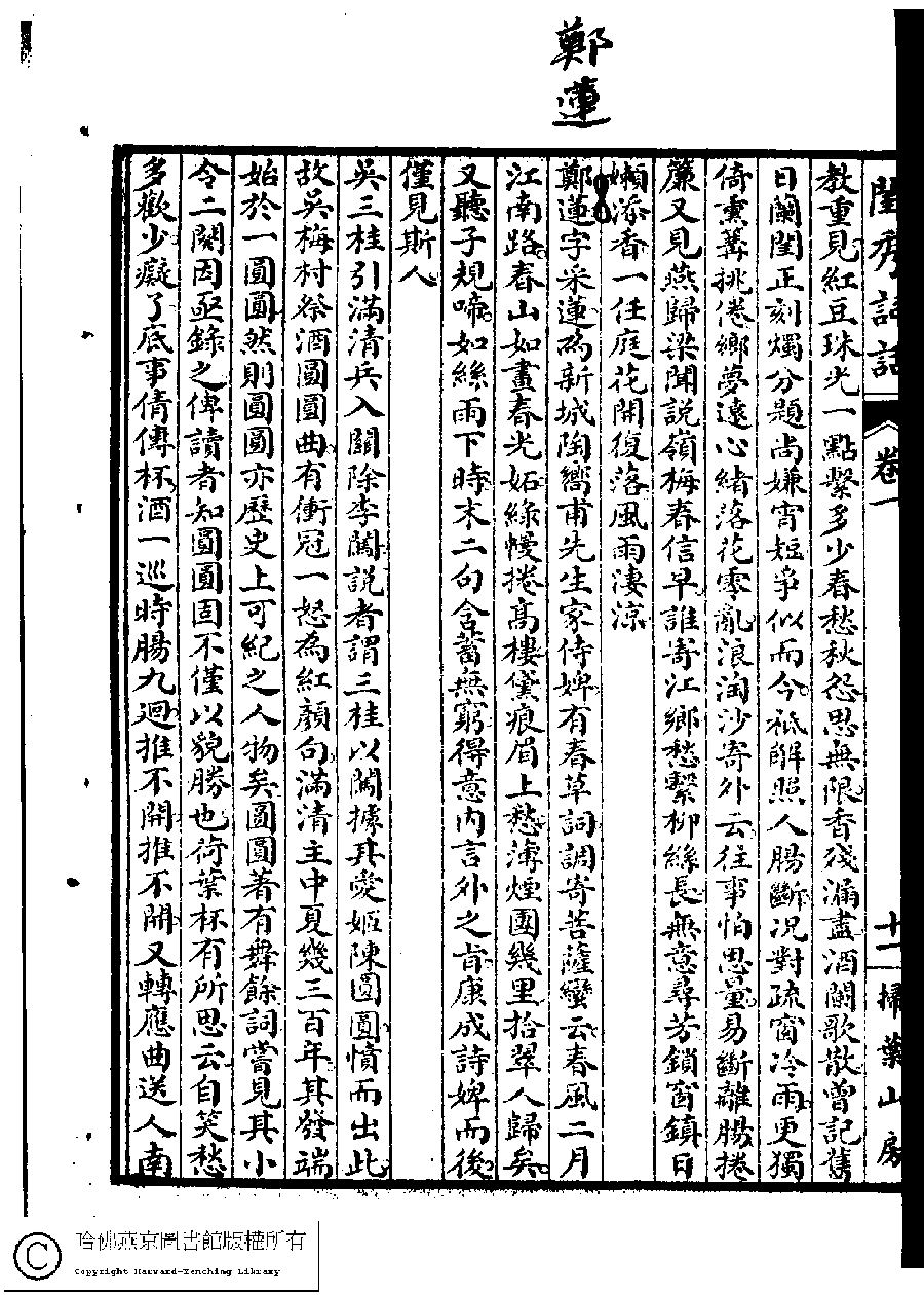 | (PRINT FRIENDLY VERSION) 閨秀詞話﹕四卷(雷瑨、雷瑊輯)。民國五年(1916)掃葉山房石印本 ![]() 頁碼 : 1.12a | 点 击 放 大 | 閨秀詞話﹕四卷(雷瑨、雷瑊輯)。民國五年(1916)掃葉山房石印本![]() 頁碼 : 1.11b | 点 击 放 大 | 返回 |