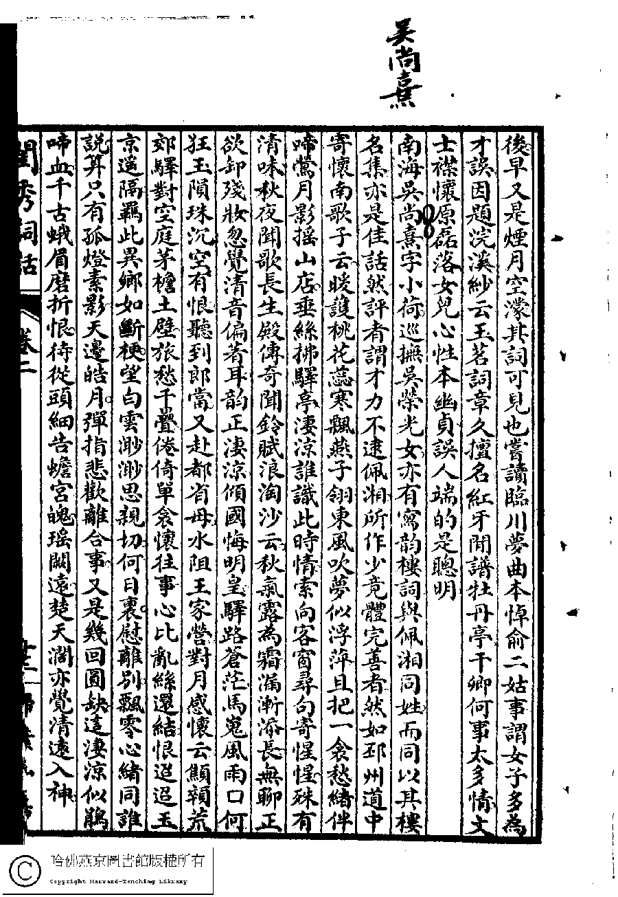 | (PRINT FRIENDLY VERSION) 閨秀詞話﹕四卷(雷瑨、雷瑊輯)。民國五年(1916)掃葉山房石印本 ![]() 頁碼 : 2.13a | 点 击 放 大 | 閨秀詞話﹕四卷(雷瑨、雷瑊輯)。民國五年(1916)掃葉山房石印本![]() 頁碼 : 2.12b | 点 击 放 大 | 返回 |