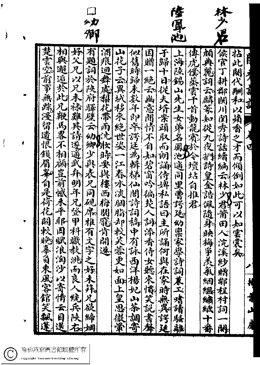 | (PRINT FRIENDLY VERSION) 閨秀詞話﹕四卷(雷瑨、雷瑊輯)。民國五年(1916)掃葉山房石印本 ![]() 頁碼 : 4.8b | 点 击 放 大 | 閨秀詞話﹕四卷(雷瑨、雷瑊輯)。民國五年(1916)掃葉山房石印本![]() 頁碼 : 4.8a | 点 击 放 大 | 返回 |