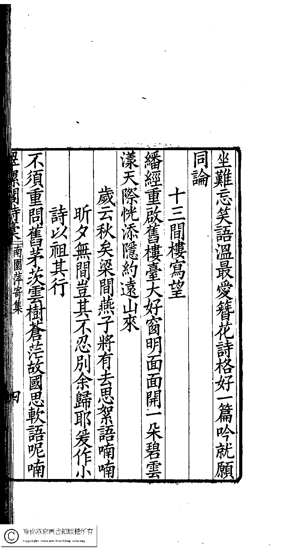 | (PRINT FRIENDLY VERSION) 翠螺閣詩詞稾﹕五卷﹐附舞鏡集﹕一卷(清凌祉媛撰)。清咸豐四年(1854)刻本。 ![]() 頁碼 : 詩稿.2.4b | 点 击 放 大 | 翠螺閣詩詞稾﹕五卷﹐附舞鏡集﹕一卷(清凌祉媛撰)。清咸豐四年(1854)刻本。![]() 頁碼 : 詩稿.2.4a | 点 击 放 大 | 返回 |