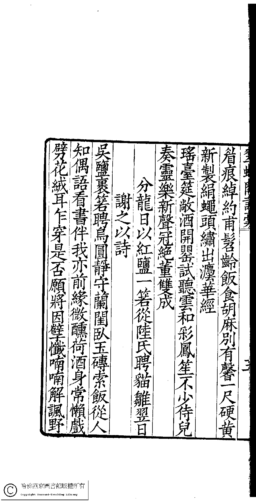| (PRINT FRIENDLY VERSION) 翠螺閣詩詞稾﹕五卷﹐附舞鏡集﹕一卷(清凌祉媛撰)。清咸豐四年(1854)刻本。 ![]() 頁碼 : 詩稿.3.3b | 点 击 放 大 | 翠螺閣詩詞稾﹕五卷﹐附舞鏡集﹕一卷(清凌祉媛撰)。清咸豐四年(1854)刻本。![]() 頁碼 : 詩稿.3.3a | 点 击 放 大 | 返回 |