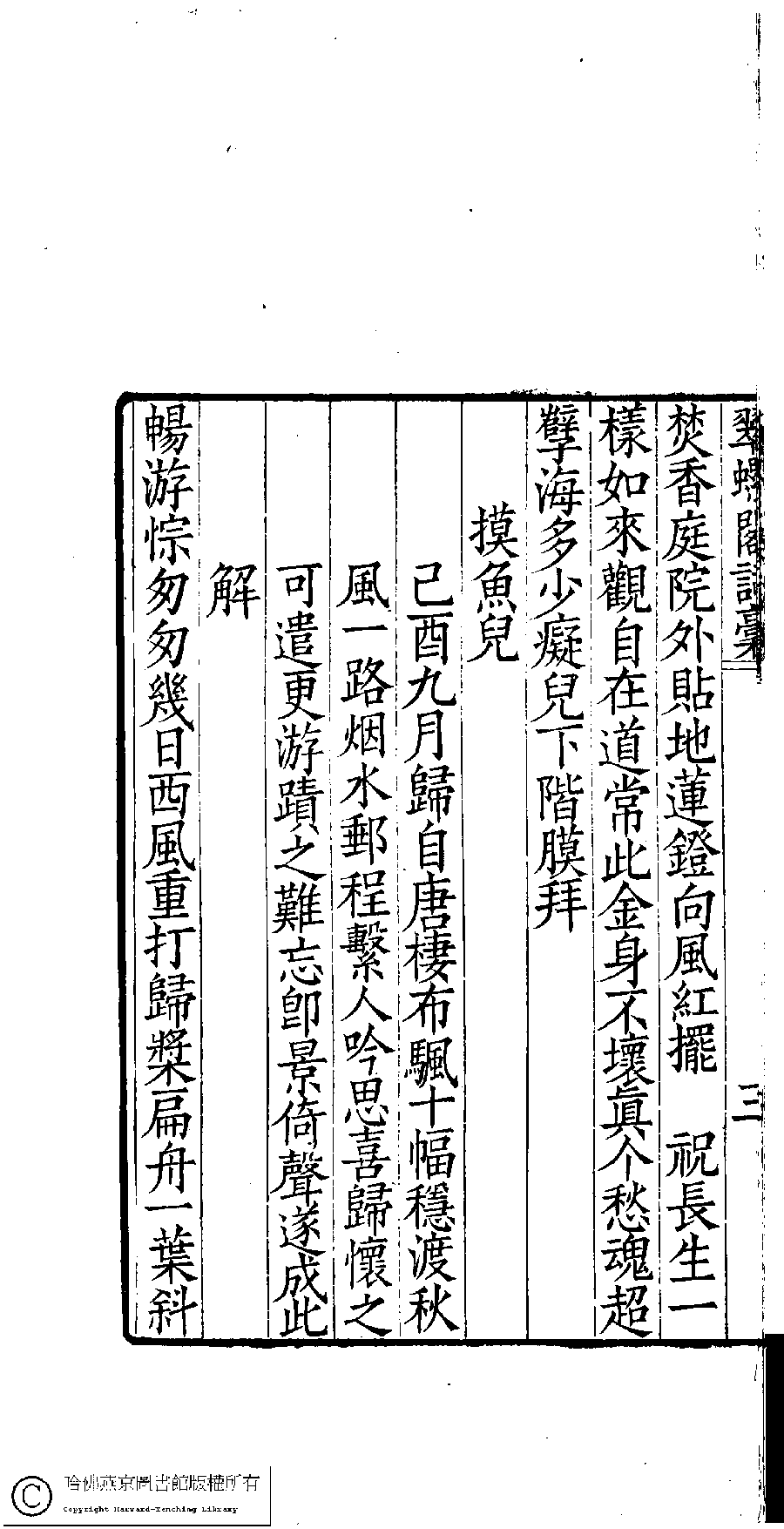| (PRINT FRIENDLY VERSION) 翠螺閣詩詞稾﹕五卷﹐附舞鏡集﹕一卷(清凌祉媛撰)。清咸豐四年(1854)刻本。 ![]() 頁碼 : 詞稿.4a | 点 击 放 大 | 翠螺閣詩詞稾﹕五卷﹐附舞鏡集﹕一卷(清凌祉媛撰)。清咸豐四年(1854)刻本。![]() 頁碼 : 詞稿.3b | 点 击 放 大 | 返回 |