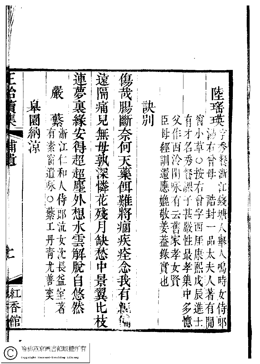 | 原書: 國朝閨秀正始續集﹕十卷﹐附錄﹕一卷﹐補遺﹕一卷﹐輓詞﹕一卷(清惲珠輯) |
