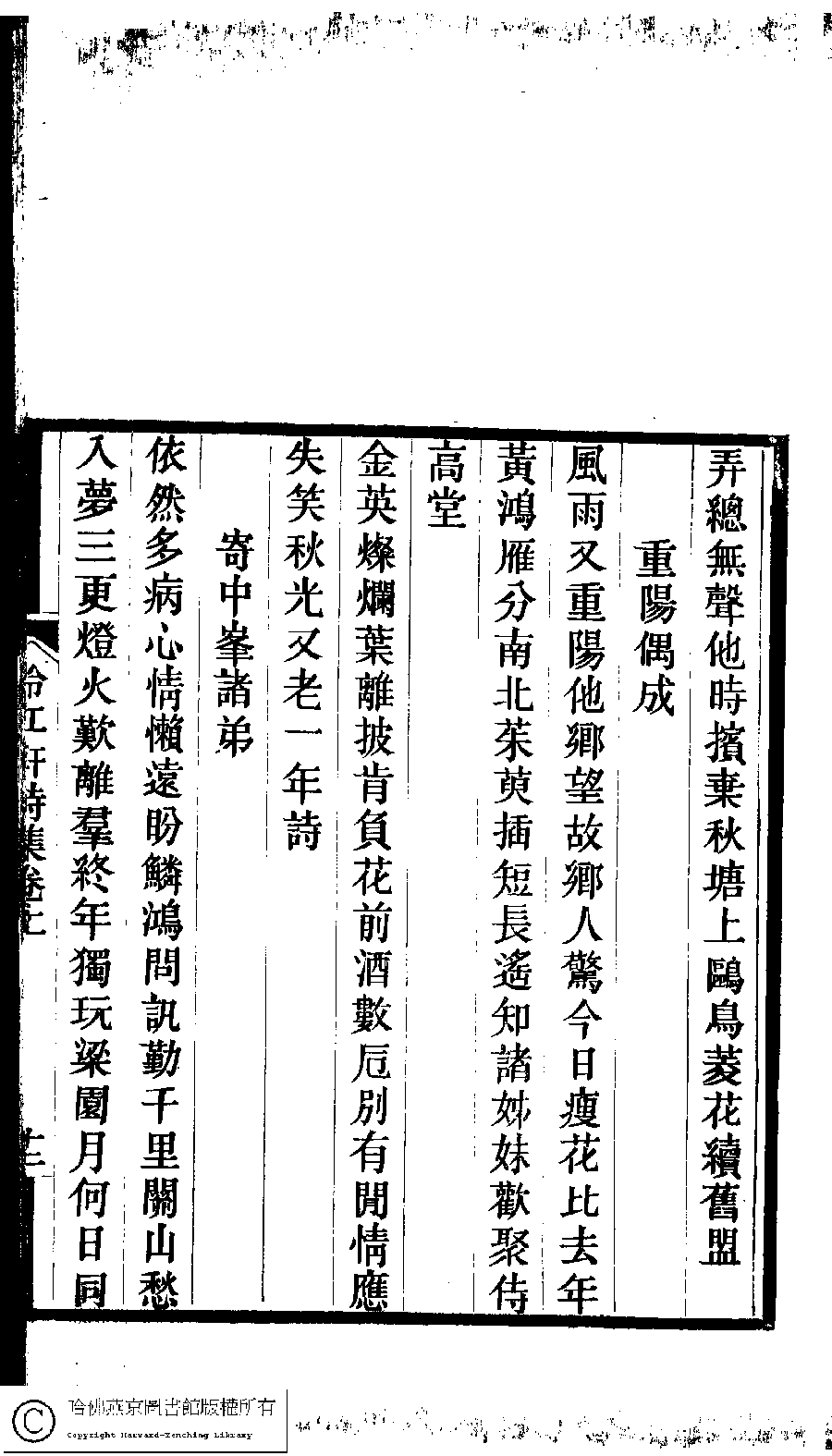 | (PRINT FRIENDLY VERSION) 冷紅軒詩集﹕二卷﹐附詞(清百保友蘭撰)。清光緒元年(1875)刻本。 ![]() 頁碼 : 上.12a | 点 击 放 大 | 冷紅軒詩集﹕二卷﹐附詞(清百保友蘭撰)。清光緒元年(1875)刻本。![]() 頁碼 : 上.11b | 点 击 放 大 | 返回 |