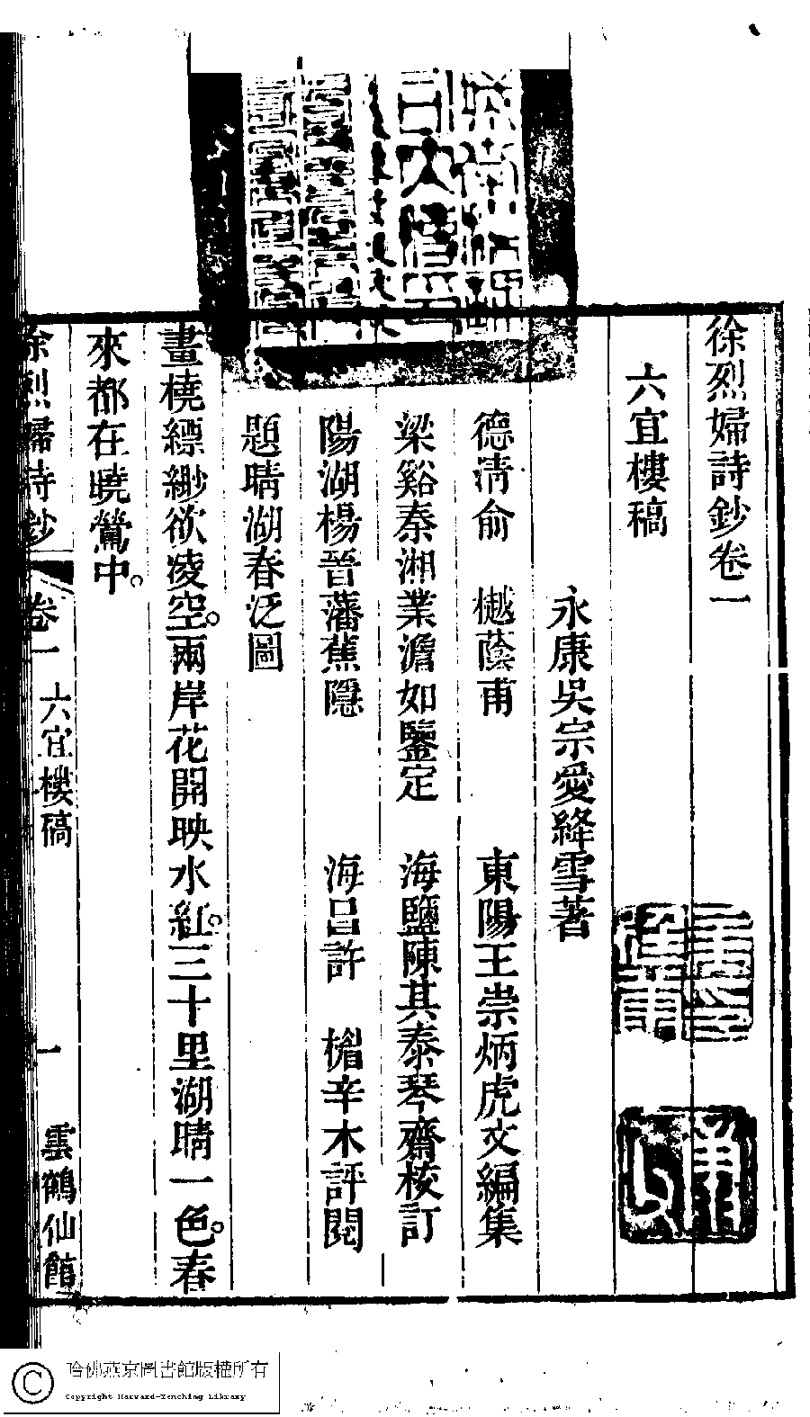 | 原書: 徐烈婦詩鈔﹕二卷﹐附吳絳雪年譜﹕一卷(清吳宗愛撰) |