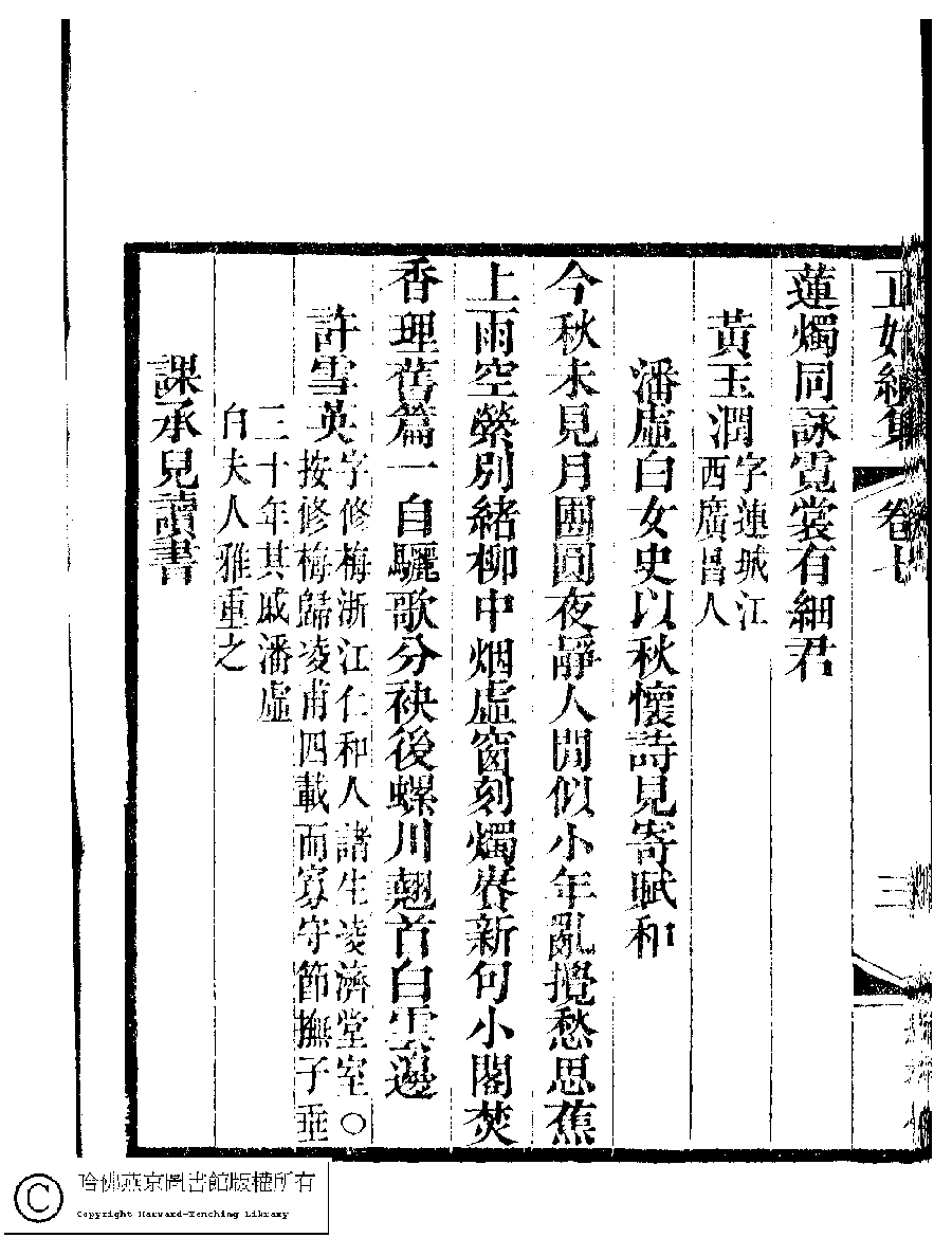 | 原書: 國朝閨秀正始續集﹕十卷﹐附錄﹕一卷﹐補遺﹕一卷﹐輓詞﹕一卷(清惲珠輯) |