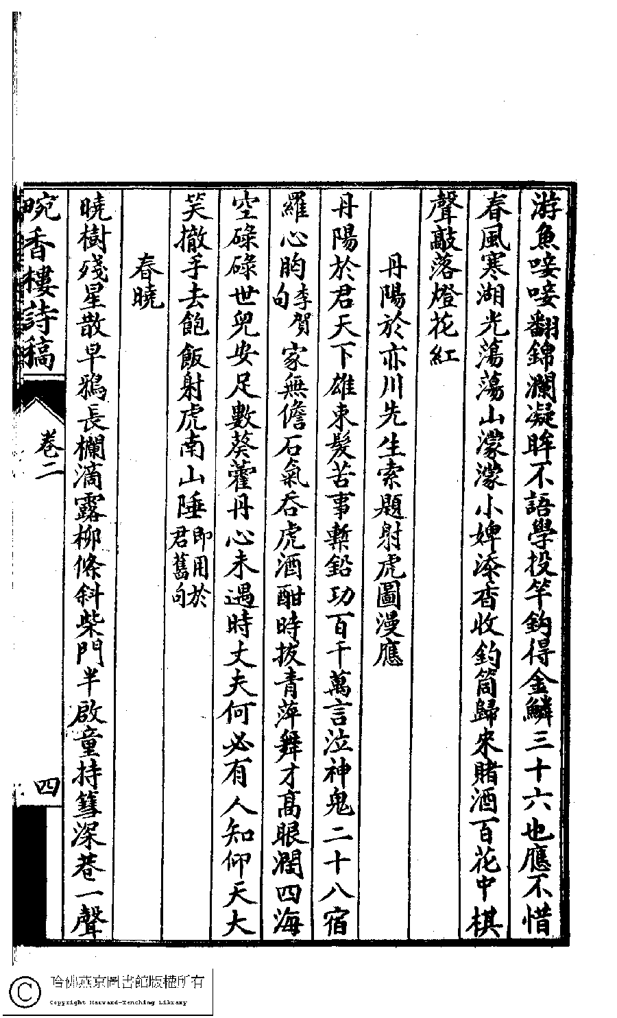 | (PRINT FRIENDLY VERSION) 畹香樓詩集﹕二卷(清梁蘭漪撰)。清光緒二十一年(1895)飛鴻閣書林石印本。 ![]() 頁碼 : 2.4a | 点 击 放 大 | 畹香樓詩集﹕二卷(清梁蘭漪撰)。清光緒二十一年(1895)飛鴻閣書林石印本。![]() 頁碼 : 2.3b | 点 击 放 大 | 返回 |