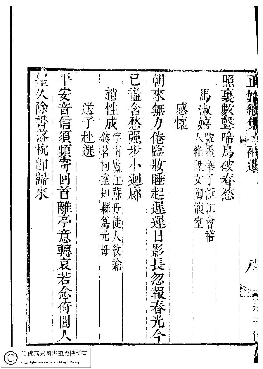 | 原書: 國朝閨秀正始續集﹕十卷﹐附錄﹕一卷﹐補遺﹕一卷﹐輓詞﹕一卷(清惲珠輯) |