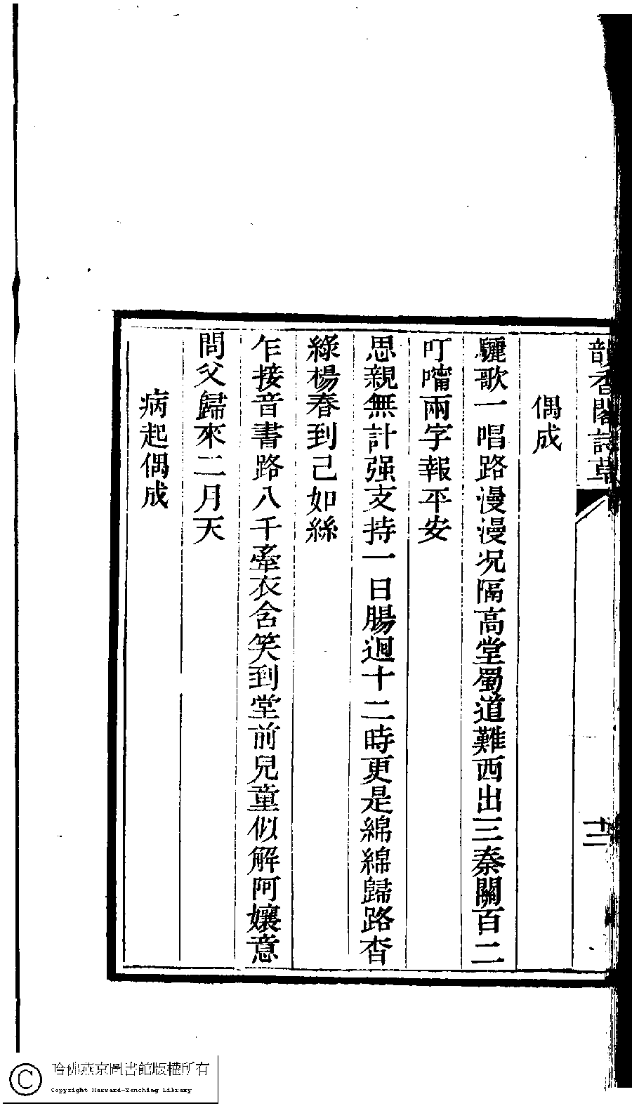 | (PRINT FRIENDLY VERSION) 韻香閣詩草﹕一卷(清孔祥淑撰)。清光緖十二年(1886)刻本。 ![]() 頁碼 : 12b | 点 击 放 大 | 返回 |