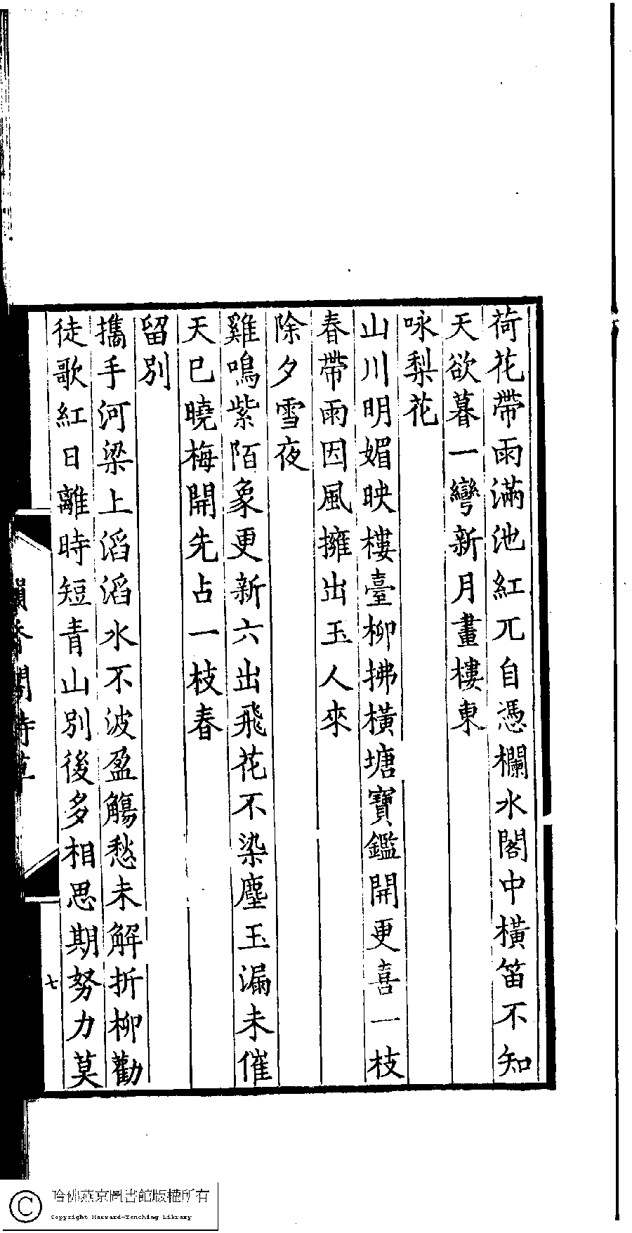 | (PRINT FRIENDLY VERSION) 韻香閣詩草﹕一卷(清孔祥淑撰)。清光緖十五年(1889)刻本。 ![]() 頁碼 : 7a | 点 击 放 大 | 韻香閣詩草﹕一卷(清孔祥淑撰)。清光緖十五年(1889)刻本。![]() 頁碼 : 6b | 点 击 放 大 | 返回 |