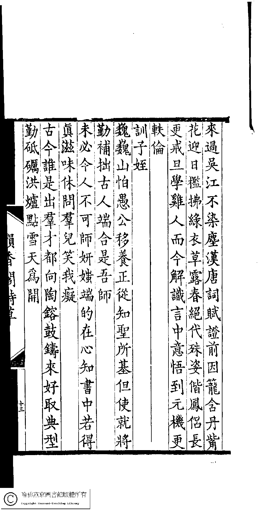 | (PRINT FRIENDLY VERSION) 韻香閣詩草﹕一卷(清孔祥淑撰)。清光緖十五年(1889)刻本。 ![]() 頁碼 : 13b | 点 击 放 大 | 韻香閣詩草﹕一卷(清孔祥淑撰)。清光緖十五年(1889)刻本。![]() 頁碼 : 13a | 点 击 放 大 | 返回 |