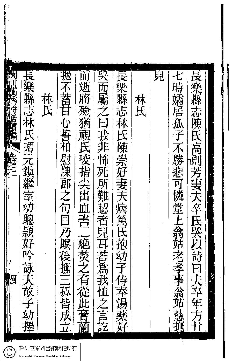 | (PRINT FRIENDLY VERSION) 閩川閨秀詩話續編﹕四卷(清丁芸輯)。民國三年(1914)刻本。 ![]() 頁碼 : 3.4a | 点 击 放 大 | 返回 |