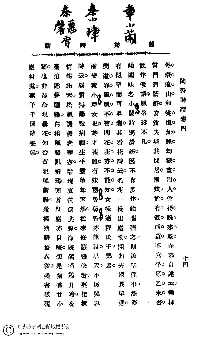 閨秀詩話﹕四卷(苕溪生輯)。民國丙寅(1926)鉛印本。