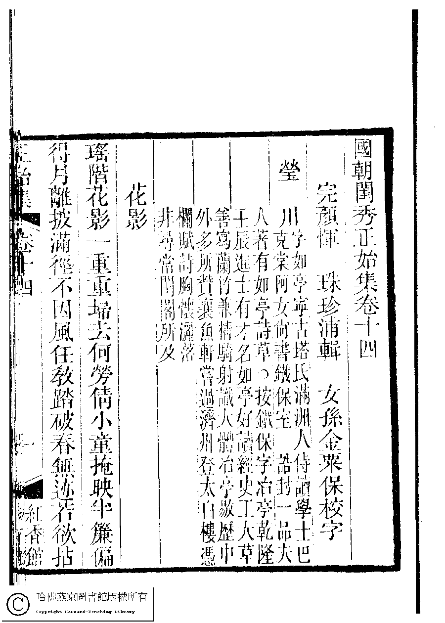 | 原書: 國朝閨秀正始集﹕二十卷﹐附錄﹕一卷﹐補遺﹕一卷﹐又附題詞﹕一卷(清惲珠輯) |