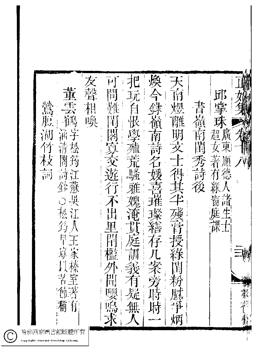 | 原書: 國朝閨秀正始集﹕二十卷﹐附錄﹕一卷﹐補遺﹕一卷﹐又附題詞﹕一卷(清惲珠輯) |