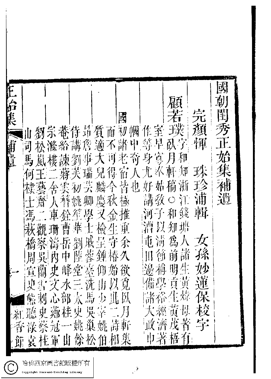 | 原書: 國朝閨秀正始集﹕二十卷﹐附錄﹕一卷﹐補遺﹕一卷﹐又附題詞﹕一卷(清惲珠輯) |