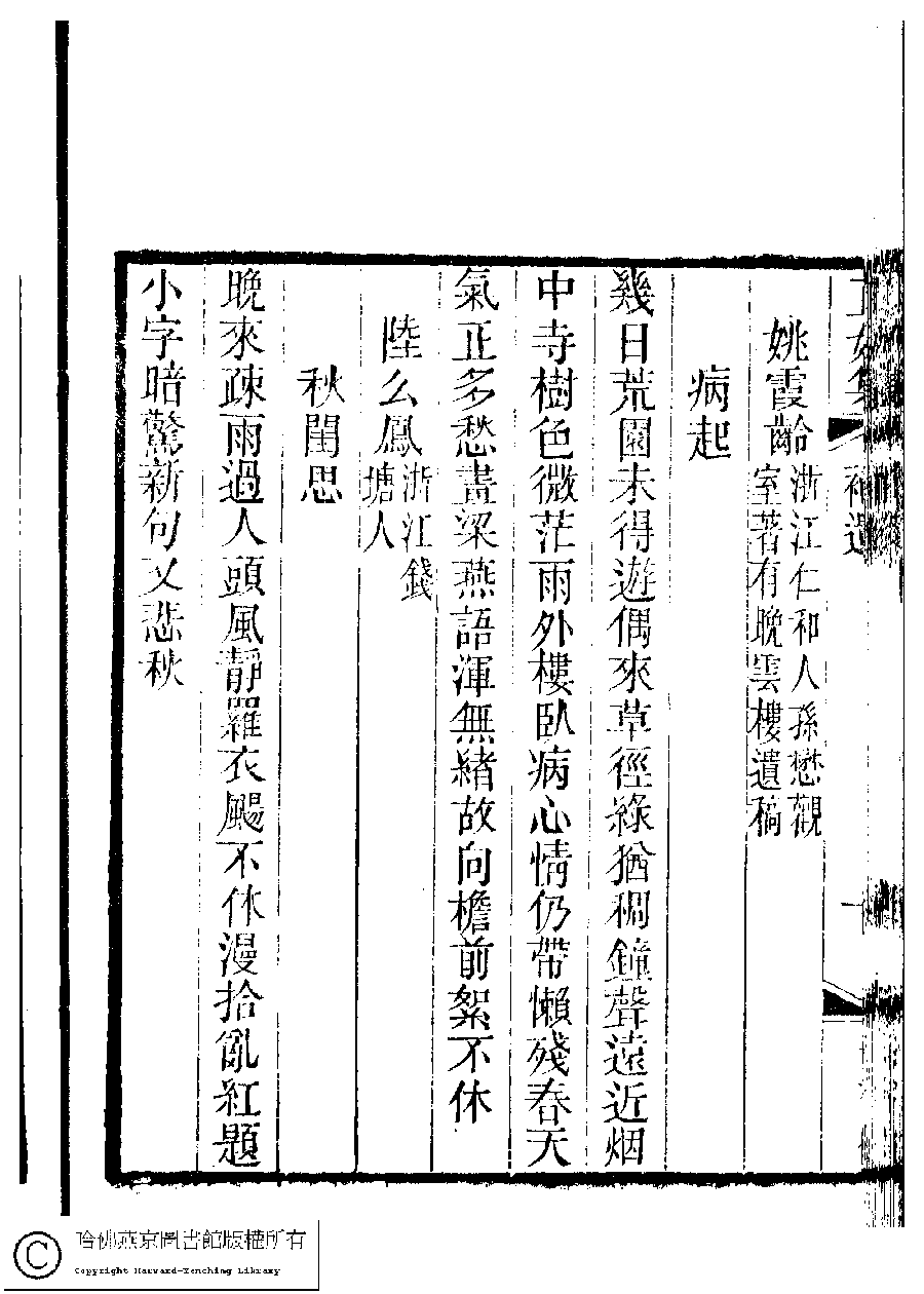 | 原書: 國朝閨秀正始集﹕二十卷﹐附錄﹕一卷﹐補遺﹕一卷﹐又附題詞﹕一卷(清惲珠輯) |
