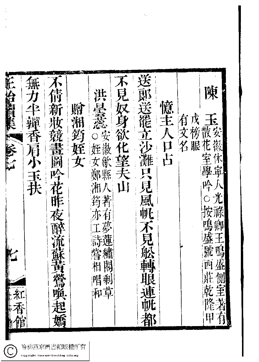 | 原書: 國朝閨秀正始續集﹕十卷﹐附錄﹕一卷﹐補遺﹕一卷﹐輓詞﹕一卷(清惲珠輯) |