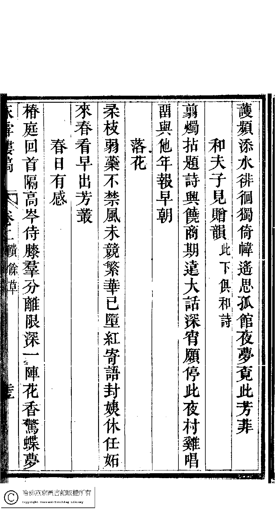 | (PRINT FRIENDLY VERSION) 詠雪樓稿﹕五卷,卷首一卷,附一卷(清甘立媃撰)。清道光二十三年(1843)徐心田半偈齋刻本。 ![]() 頁碼 : 2.25a | 点 击 放 大 | 返回 |