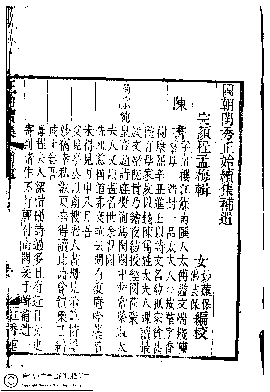 | 原書: 國朝閨秀正始續集﹕十卷﹐附錄﹕一卷﹐補遺﹕一卷﹐輓詞﹕一卷(清惲珠輯) |
