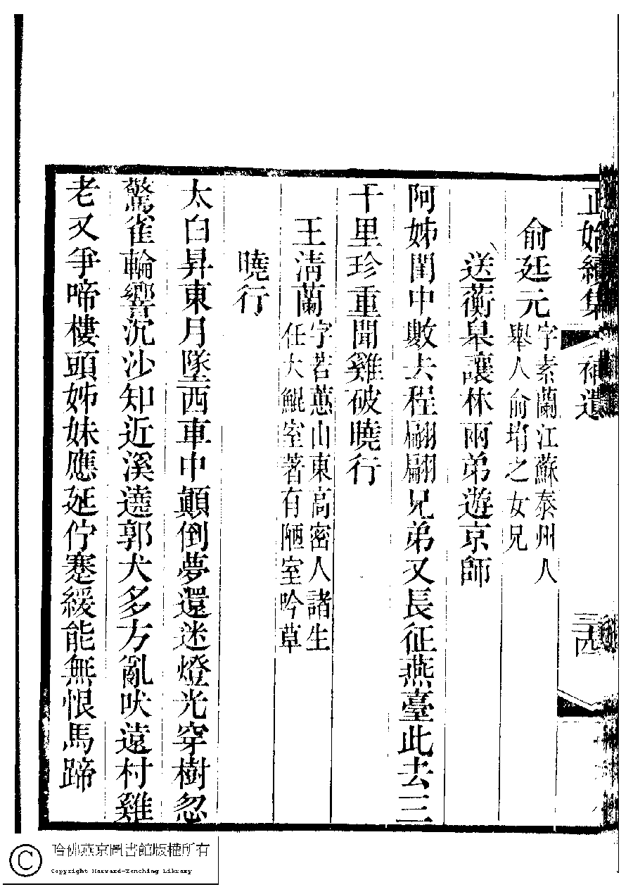 | 原書: 國朝閨秀正始續集﹕十卷﹐附錄﹕一卷﹐補遺﹕一卷﹐輓詞﹕一卷(清惲珠輯) |