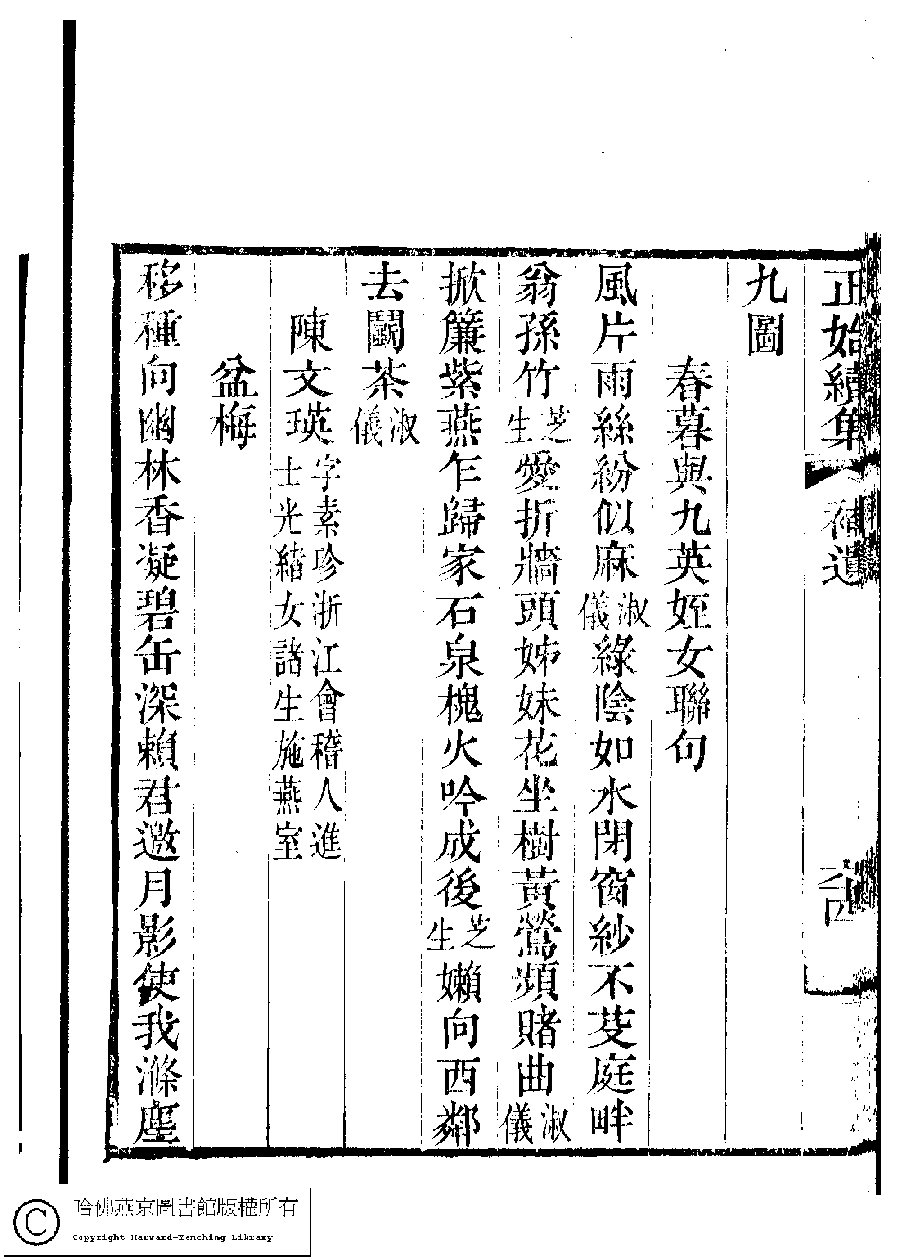 | 原書: 國朝閨秀正始續集﹕十卷﹐附錄﹕一卷﹐補遺﹕一卷﹐輓詞﹕一卷(清惲珠輯) |