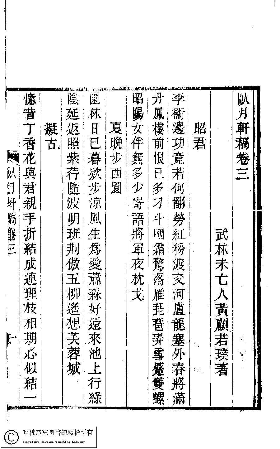 臥月軒稿﹕三卷(清顧若璞撰)。光緒嘉惠堂丁氏刻本。