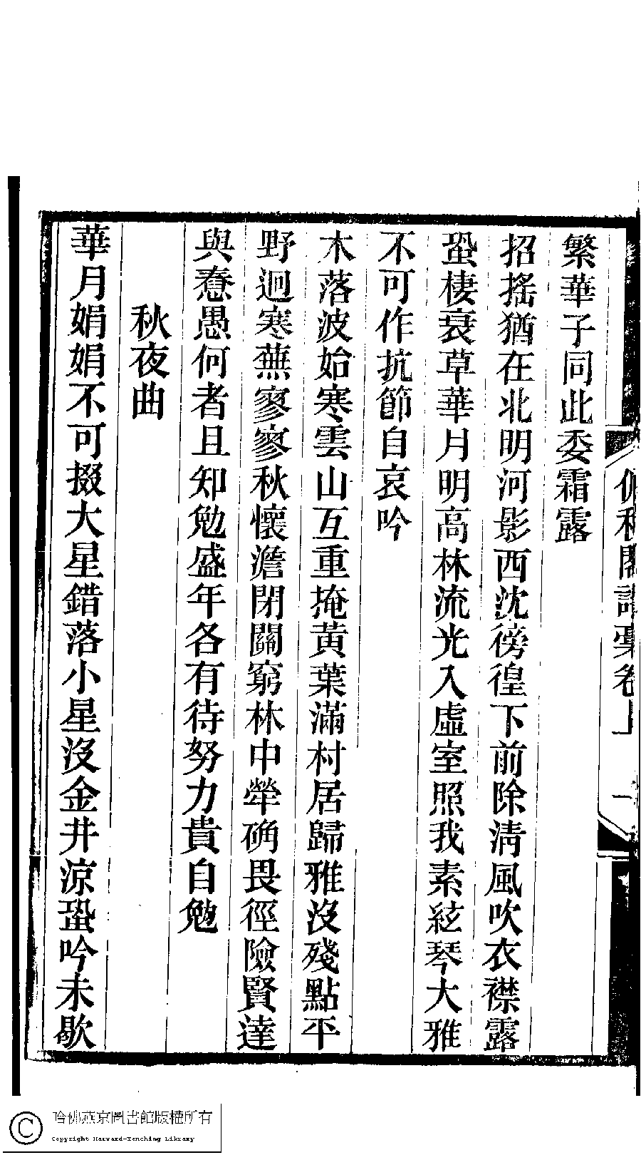 | (PRINT FRIENDLY VERSION) 佩秋閣遺稿﹕二卷﹐詞稿﹕一卷﹐文稿﹕一卷(清吳茝撰)。清光緒十四年(1888)刻本。 ![]() 頁碼 : 1.2a | 点 击 放 大 | 佩秋閣遺稿﹕二卷﹐詞稿﹕一卷﹐文稿﹕一卷(清吳茝撰)。清光緒十四年(1888)刻本。![]() 頁碼 : 1.1b | 点 击 放 大 | 返回 |
