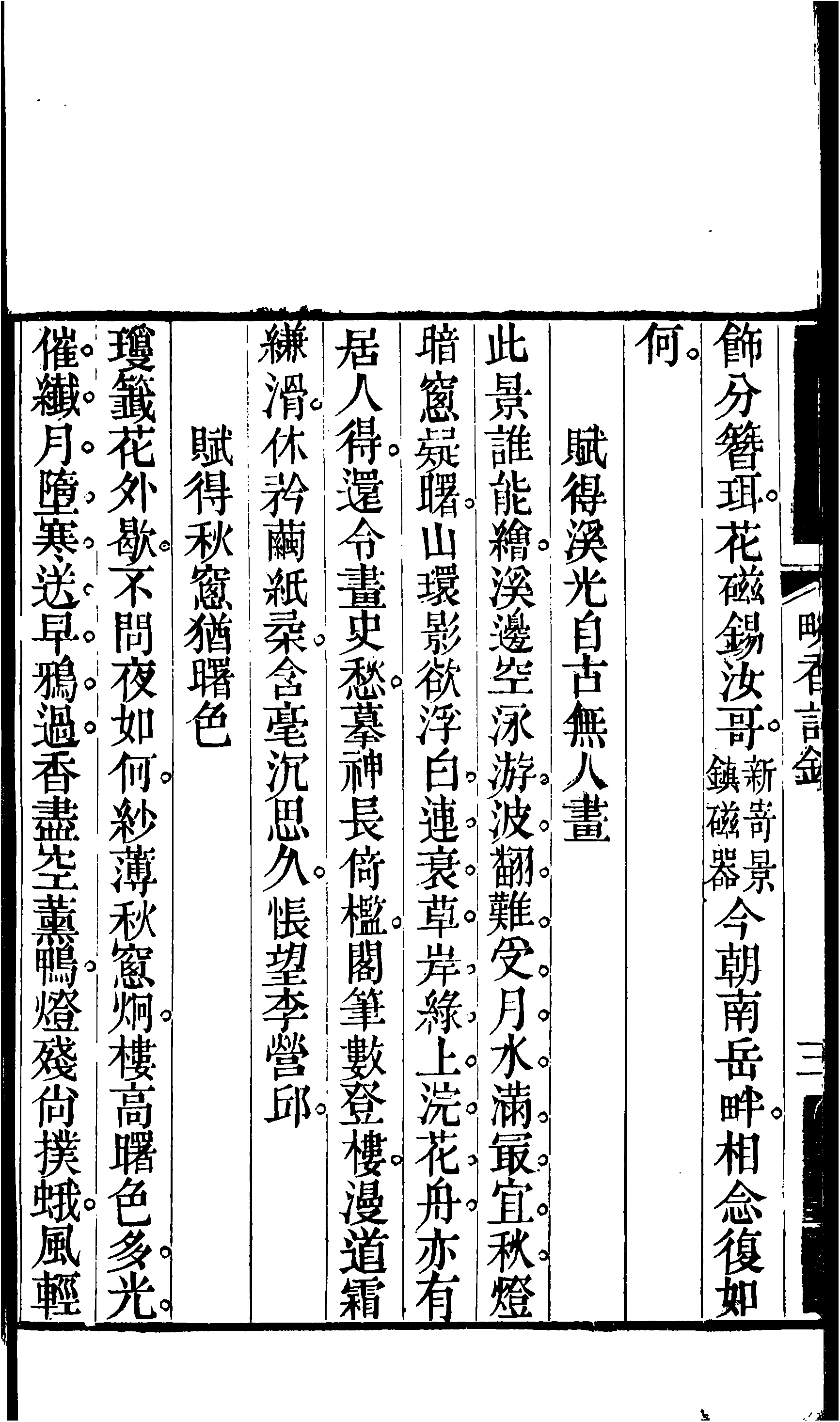 | (PRINT FRIENDLY VERSION) 畹香詩鈔(清張淑撰)。清嘉慶十三年(1808)潛江熊氏刻本。 ![]() 頁碼 : 3b | 点 击 放 大 | 畹香詩鈔(清張淑撰)。清嘉慶十三年(1808)潛江熊氏刻本。![]() 頁碼 : 3a | 点 击 放 大 | 返回 |