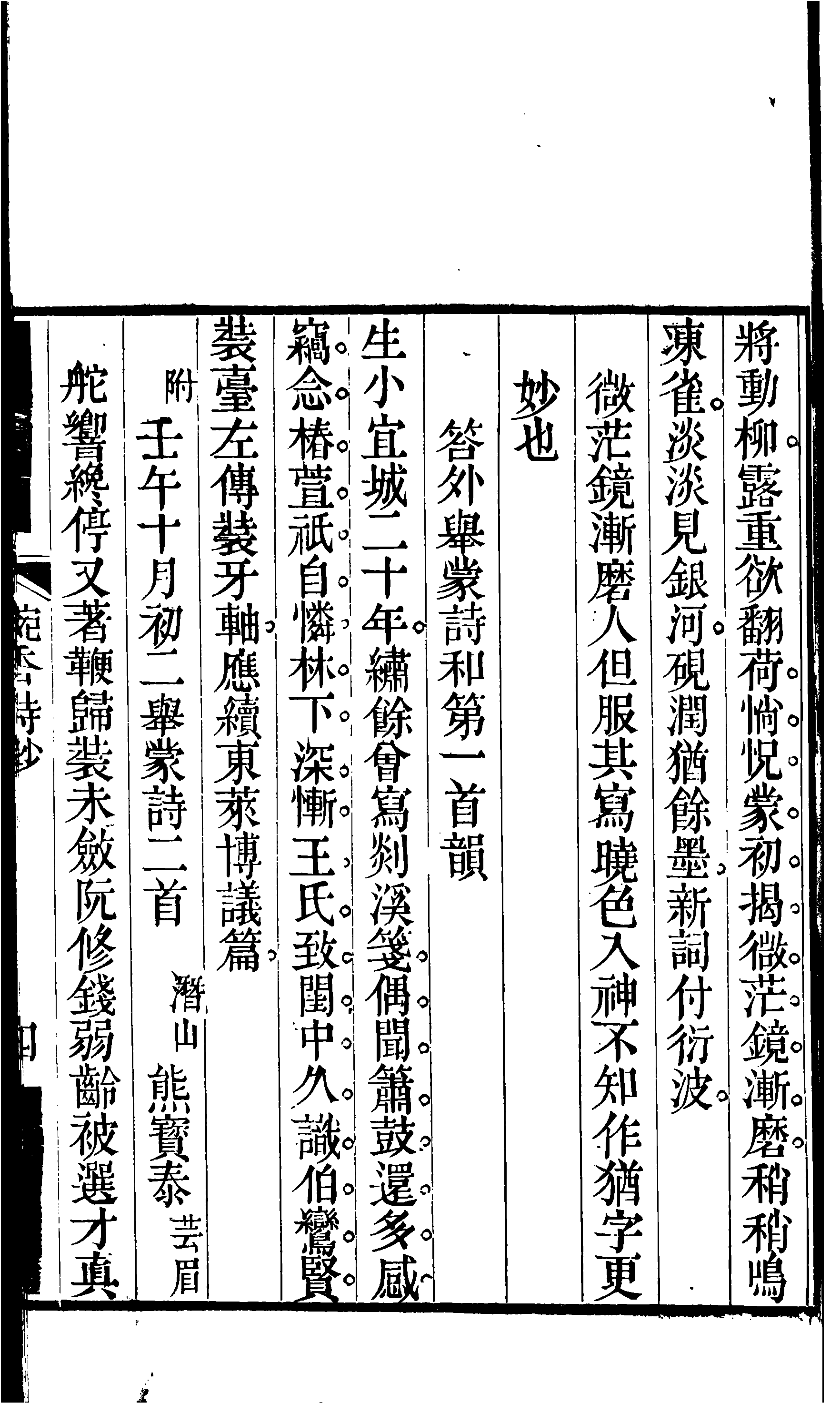 | (PRINT FRIENDLY VERSION) 畹香詩鈔(清張淑撰)。清嘉慶十三年(1808)潛江熊氏刻本。 ![]() 頁碼 : 4a | 点 击 放 大 | 畹香詩鈔(清張淑撰)。清嘉慶十三年(1808)潛江熊氏刻本。![]() 頁碼 : 3b | 点 击 放 大 | 返回 |