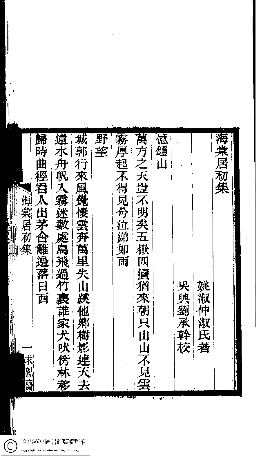 海棠居詩集(清姚淑撰)。民國十一年(1922)南林劉氏刻本