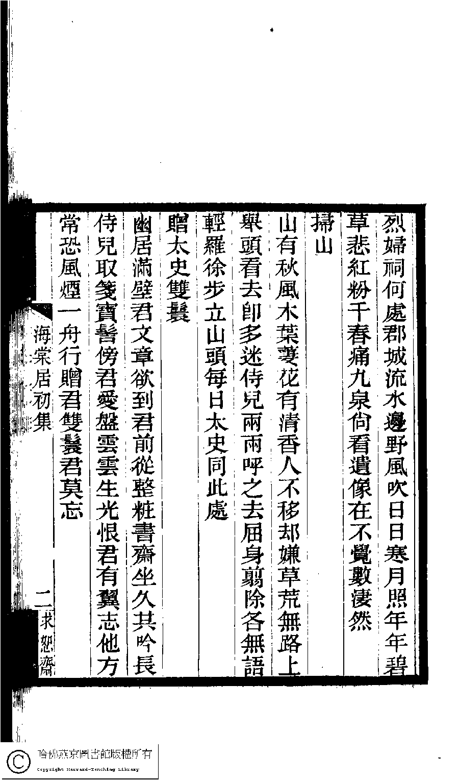| (PRINT FRIENDLY VERSION) 海棠居詩集(清姚淑撰)。民國十一年(1922)南林劉氏刻本 ![]() 頁碼 : 2a | 点 击 放 大 | 海棠居詩集(清姚淑撰)。民國十一年(1922)南林劉氏刻本![]() 頁碼 : 1b | 点 击 放 大 | 返回 |