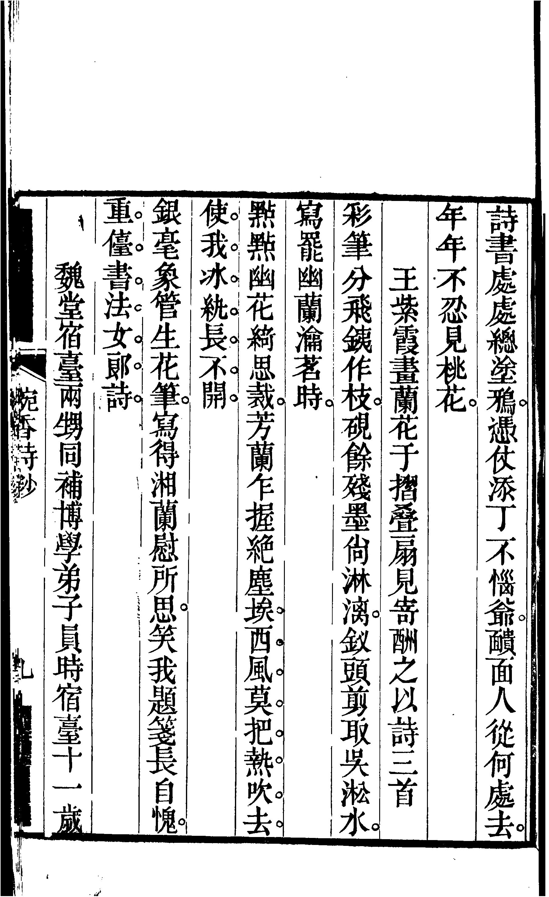 | (PRINT FRIENDLY VERSION) 畹香詩鈔(清張淑撰)。清嘉慶十三年(1808)潛江熊氏刻本。 ![]() 頁碼 : 9b | 点 击 放 大 | 畹香詩鈔(清張淑撰)。清嘉慶十三年(1808)潛江熊氏刻本。![]() 頁碼 : 9a | 点 击 放 大 | 返回 |