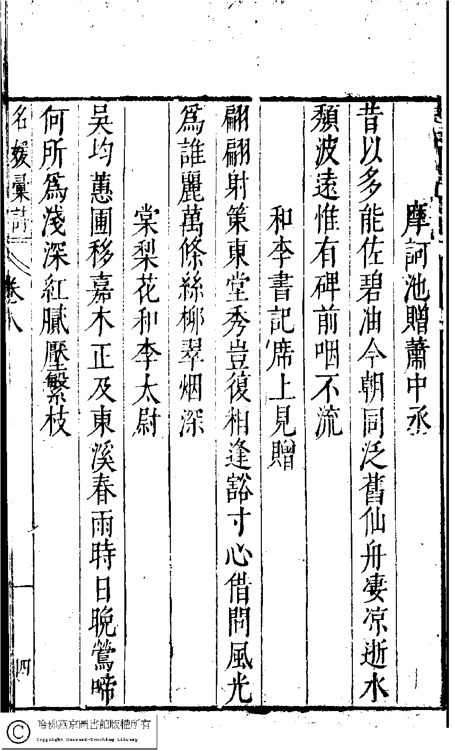 | (PRINT FRIENDLY VERSION) 名媛彙詩﹕二十卷(明鄭文昂編)。張正岳明泰昌元年(1620)刻本。 ![]() 頁碼 : 8.4a | 点 击 放 大 | 返回 |