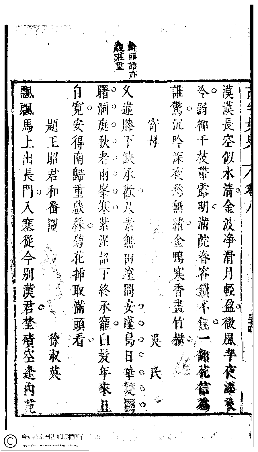 | (PRINT FRIENDLY VERSION) 古今女史﹕十二卷﹐詩集﹕八卷﹐附姓氏字里詳節﹕一卷(明趙世杰輯)。明崇禎(1628-1644)問奇閣刻本 ![]() 頁碼 : 8.34b | 点 击 放 大 | 古今女史﹕十二卷﹐詩集﹕八卷﹐附姓氏字里詳節﹕一卷(明趙世杰輯)。明崇禎(1628-1644)問奇閣刻本![]() 頁碼 : 8.34a | 点 击 放 大 | 返回 |