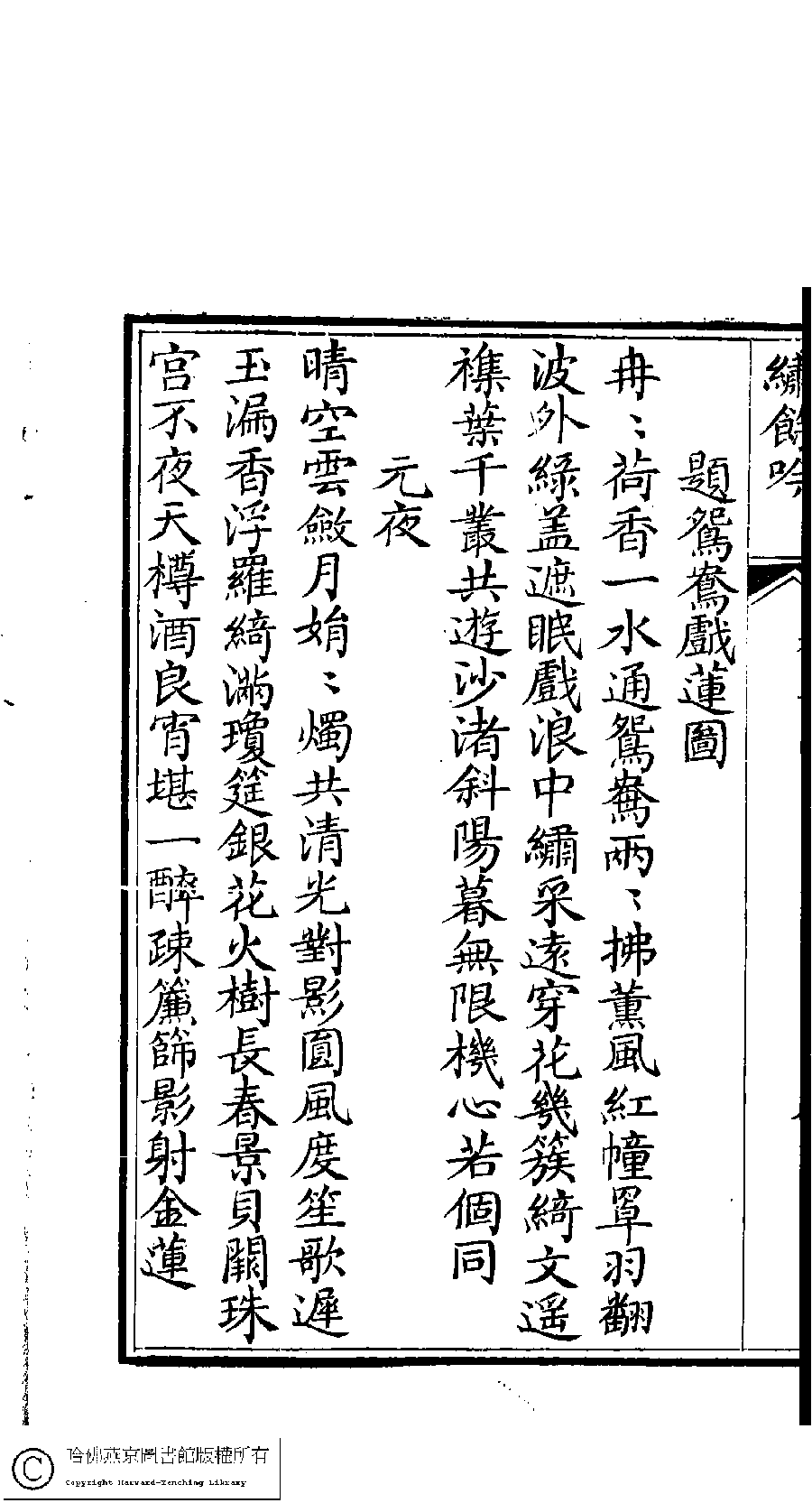 | 原書: 繡餘吟﹕六卷﹐附詩餘一卷(清馮思慧撰) |