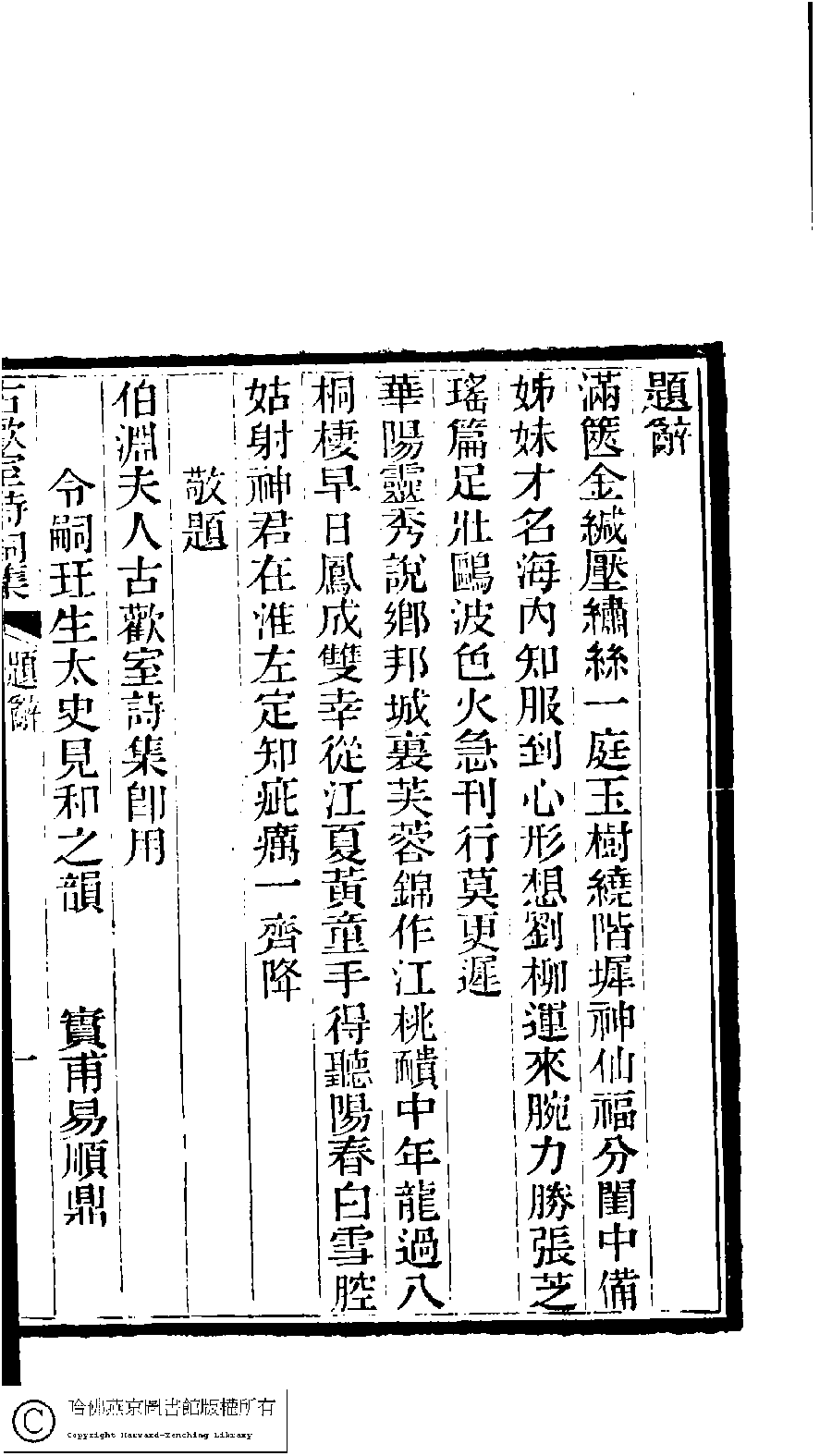 | (PRINT FRIENDLY VERSION) 古歡室詩集:三卷﹐詞集﹕一卷(清曾懿撰)。清光緖三十三年(1907)刻本。 ![]() 頁碼 : 題辭.1a | 点 击 放 大 | 返回 |