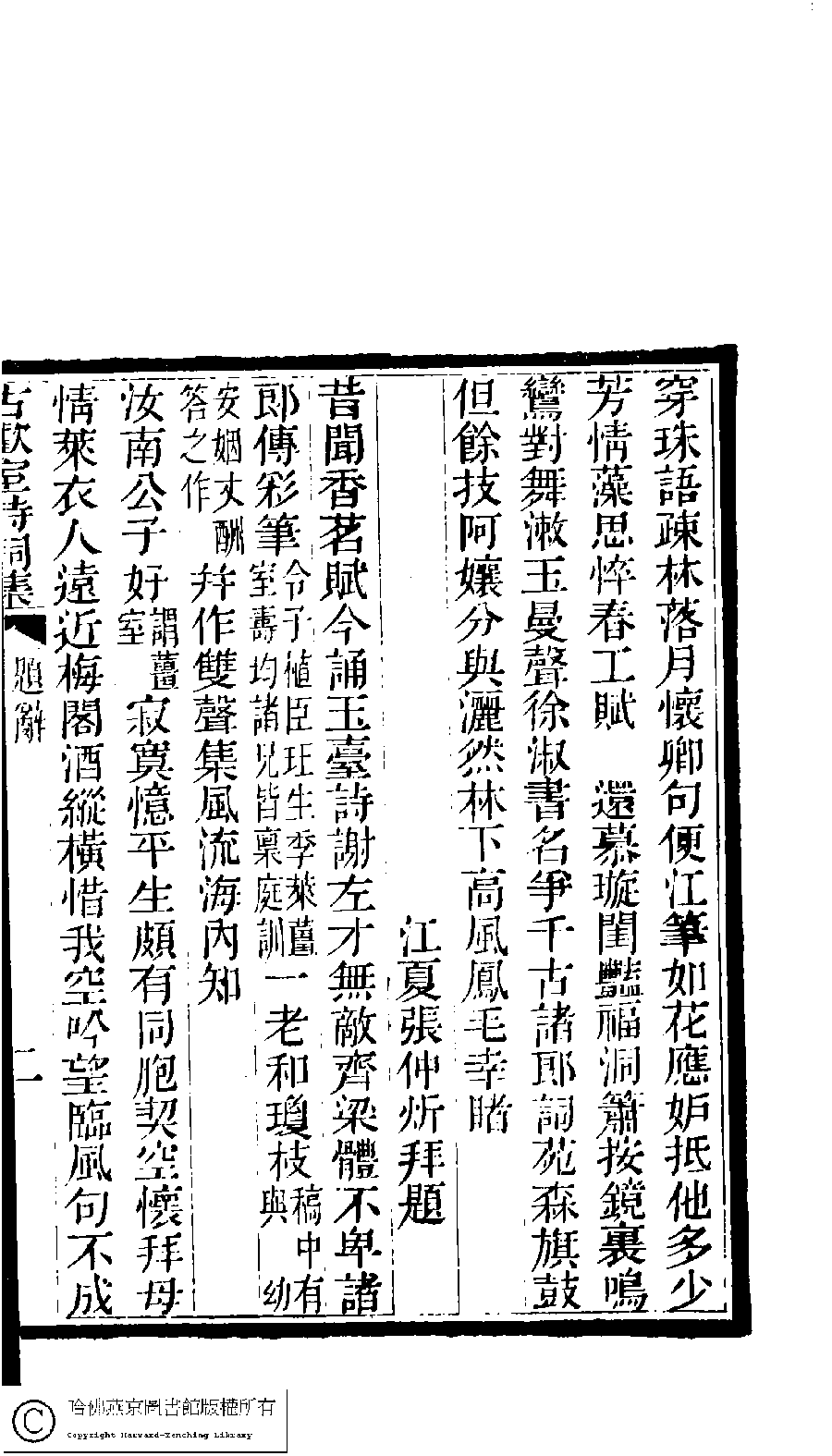 | (PRINT FRIENDLY VERSION) 古歡室詩集:三卷﹐詞集﹕一卷(清曾懿撰)。清光緖三十三年(1907)刻本。 ![]() 頁碼 : 題辭.2a | 点 击 放 大 | 返回 |