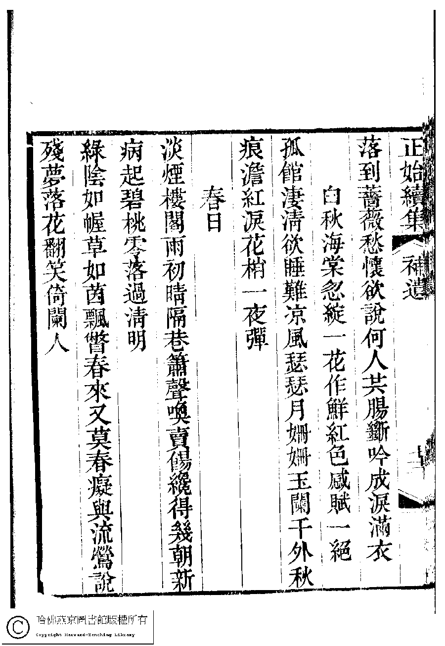 | 原書: 國朝閨秀正始續集﹕十卷﹐附錄﹕一卷﹐補遺﹕一卷﹐輓詞﹕一卷(清惲珠輯) |