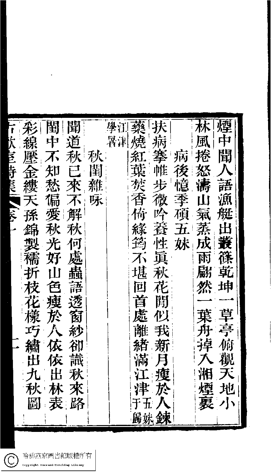 | (PRINT FRIENDLY VERSION) 古歡室詩集:三卷﹐詞集﹕一卷(清曾懿撰)。清光緖三十三年(1907)刻本。 ![]() 頁碼 : 1.11a | 点 击 放 大 | 返回 |