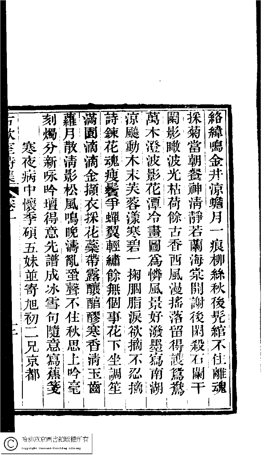 | (PRINT FRIENDLY VERSION) 古歡室詩集:三卷﹐詞集﹕一卷(清曾懿撰)。清光緖三十三年(1907)刻本。 ![]() 頁碼 : 1.12a | 点 击 放 大 | 古歡室詩集:三卷﹐詞集﹕一卷(清曾懿撰)。清光緖三十三年(1907)刻本。![]() 頁碼 : 1.11b | 点 击 放 大 | 古歡室詩集:三卷﹐詞集﹕一卷(清曾懿撰)。清光緖三十三年(1907)刻本。![]() 頁碼 : 1.11a | 点 击 放 大 | 返回 |