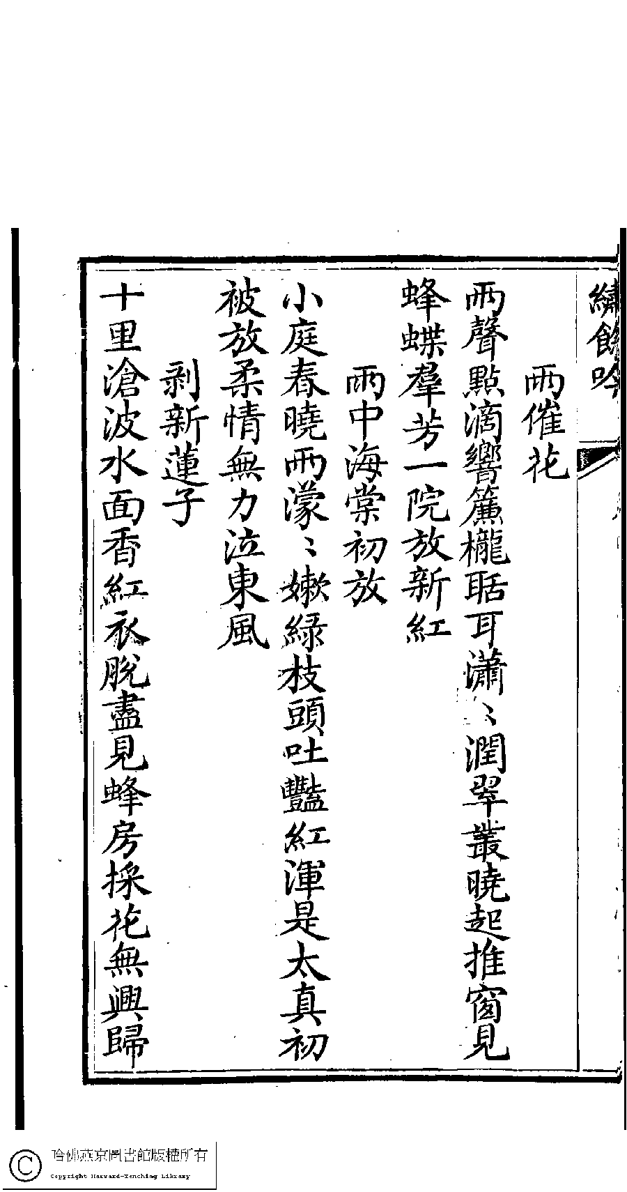 | 原書: 繡餘吟﹕六卷﹐附詩餘一卷(清馮思慧撰) |