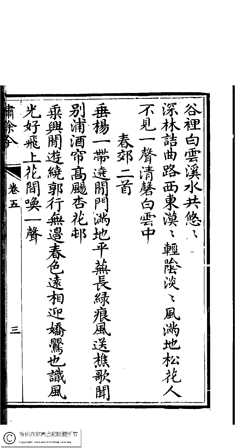 | (PRINT FRIENDLY VERSION) 繡餘吟﹕六卷﹐附詩餘一卷(清馮思慧撰)。清乾隆二十九年(1764)刻本 ![]() 頁碼 : 5.3a | 点 击 放 大 | 返回 |