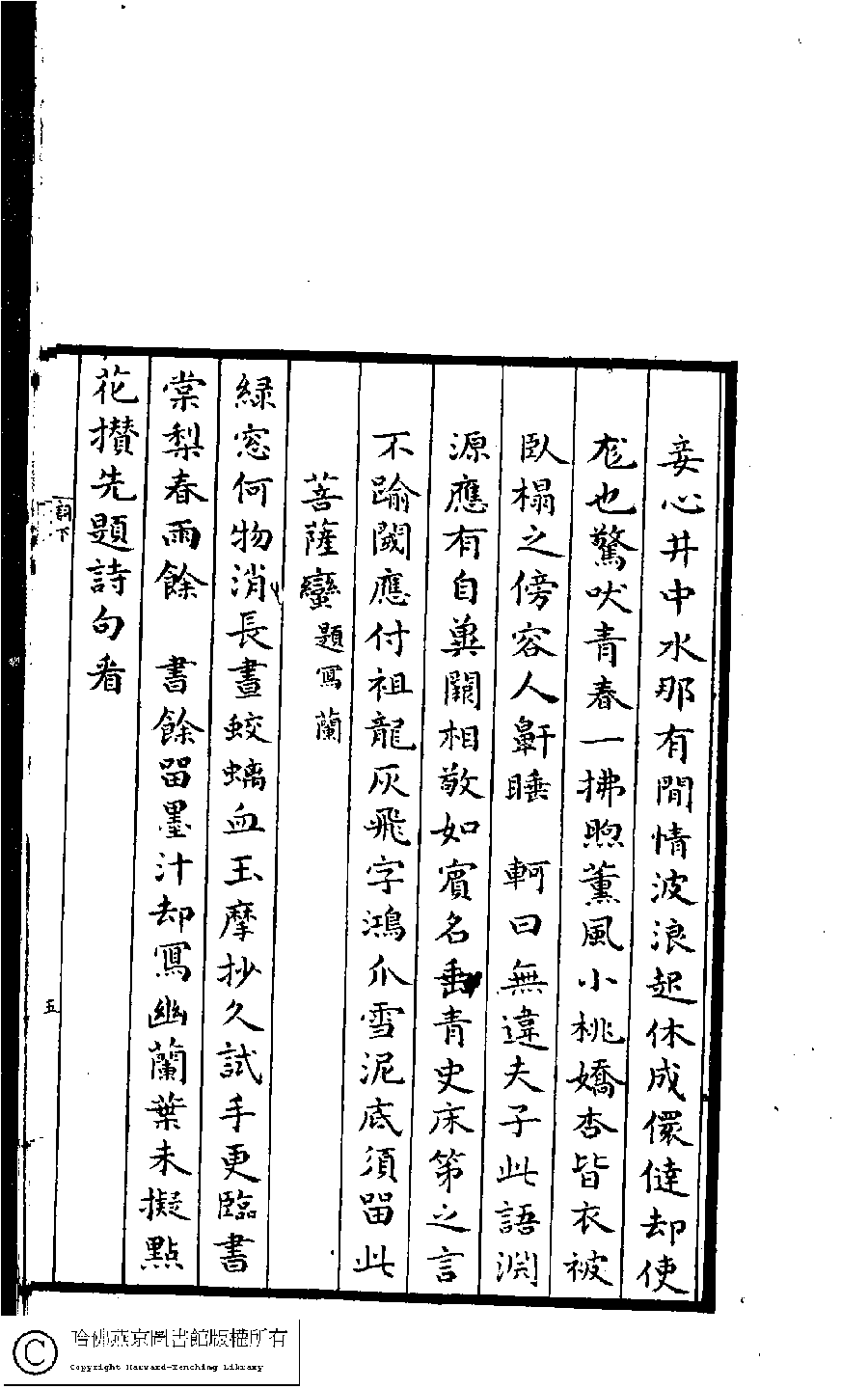 | (PRINT FRIENDLY VERSION) 春雨樓稾(清沈彩撰)。民國十三年(1924)影印手稿本 ![]() 頁碼 : 詞下.5a | 点 击 放 大 | 春雨樓稾(清沈彩撰)。民國十三年(1924)影印手稿本![]() 頁碼 : 詞下.4b | 点 击 放 大 | 返回 |