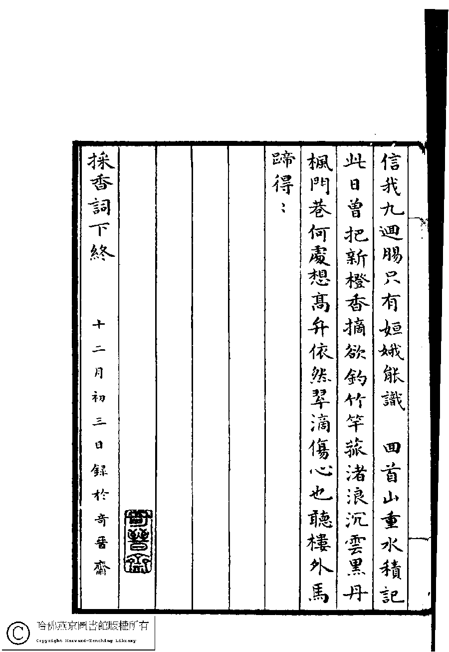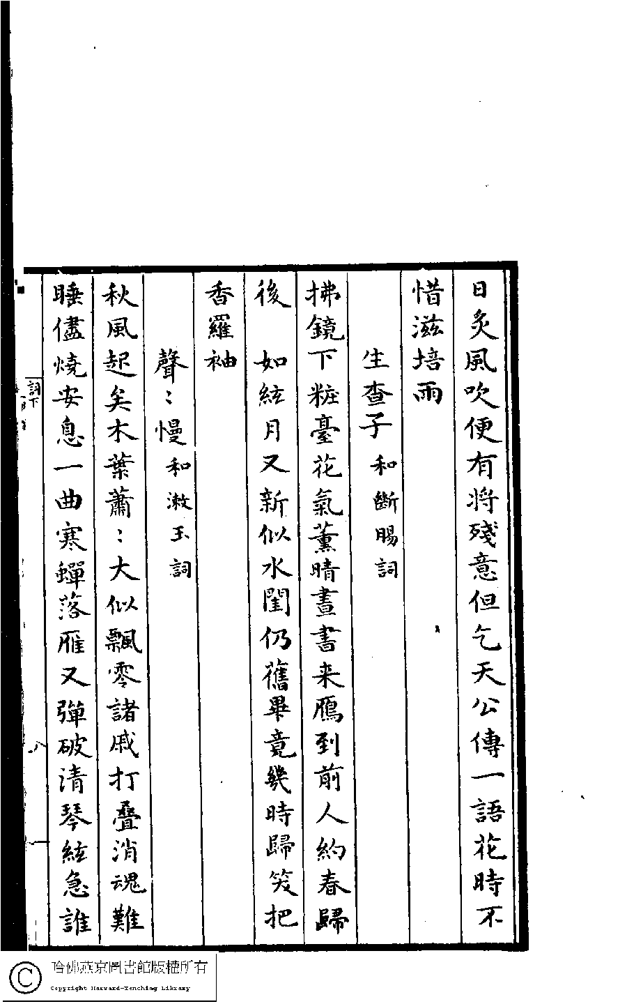 | (PRINT FRIENDLY VERSION) 春雨樓稾(清沈彩撰)。民國十三年(1924)影印手稿本 ![]() 頁碼 : 詞下.8b | 点 击 放 大 | 春雨樓稾(清沈彩撰)。民國十三年(1924)影印手稿本![]() 頁碼 : 詞下.8a | 点 击 放 大 | 返回 |