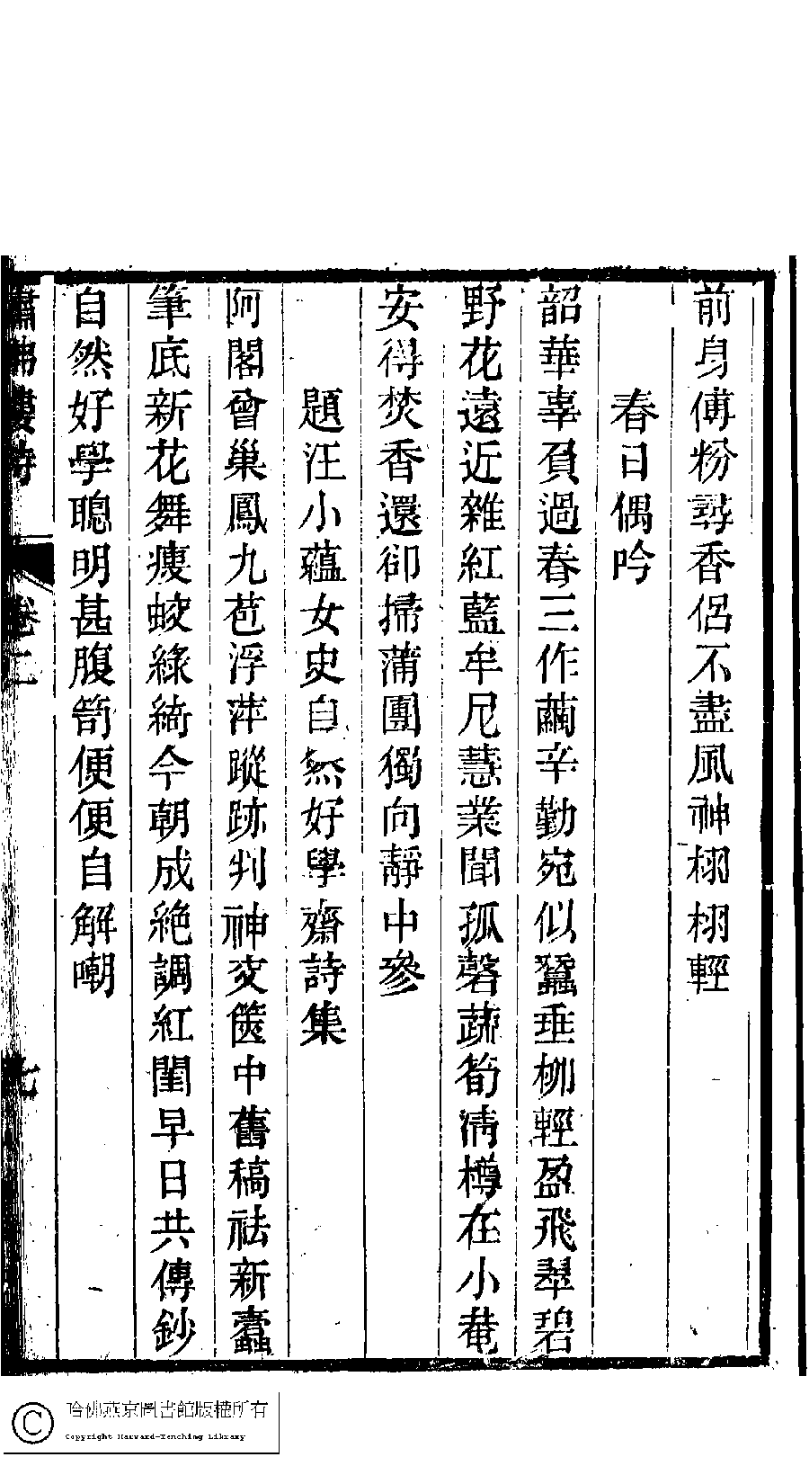 | (PRINT FRIENDLY VERSION) 繡佛樓詩稿﹕二卷(清錢守璞撰)。清同治八年(1869)刻本。 ![]() 頁碼 : 2.7a | 点 击 放 大 | 返回 |