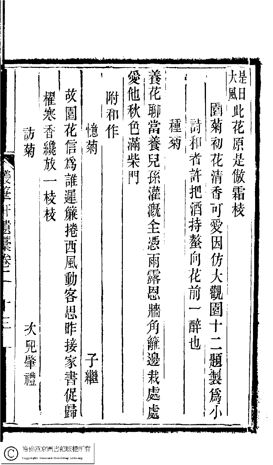 詩詞 [園菊初花清香可愛因仿大觀園十二題製為小詩和者許把酒持螯向花前一醉也:種菊]