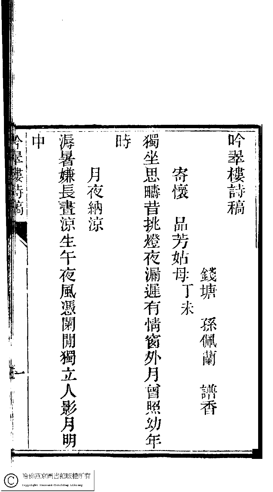 | 原書: 吟翠樓詩稿﹕一卷﹐附刻﹕一卷(清孫佩蘭撰) |