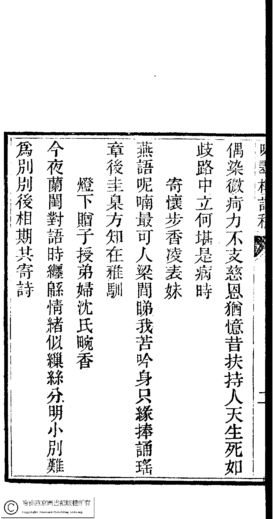 | (PRINT FRIENDLY VERSION) 吟翠樓詩稿﹕一卷﹐附刻﹕一卷(清孫佩蘭撰)。光緖十四年(1888)刻本。 ![]() 頁碼 : 2b | 点 击 放 大 | 吟翠樓詩稿﹕一卷﹐附刻﹕一卷(清孫佩蘭撰)。光緖十四年(1888)刻本。![]() 頁碼 : 2a | 点 击 放 大 | 返回 |