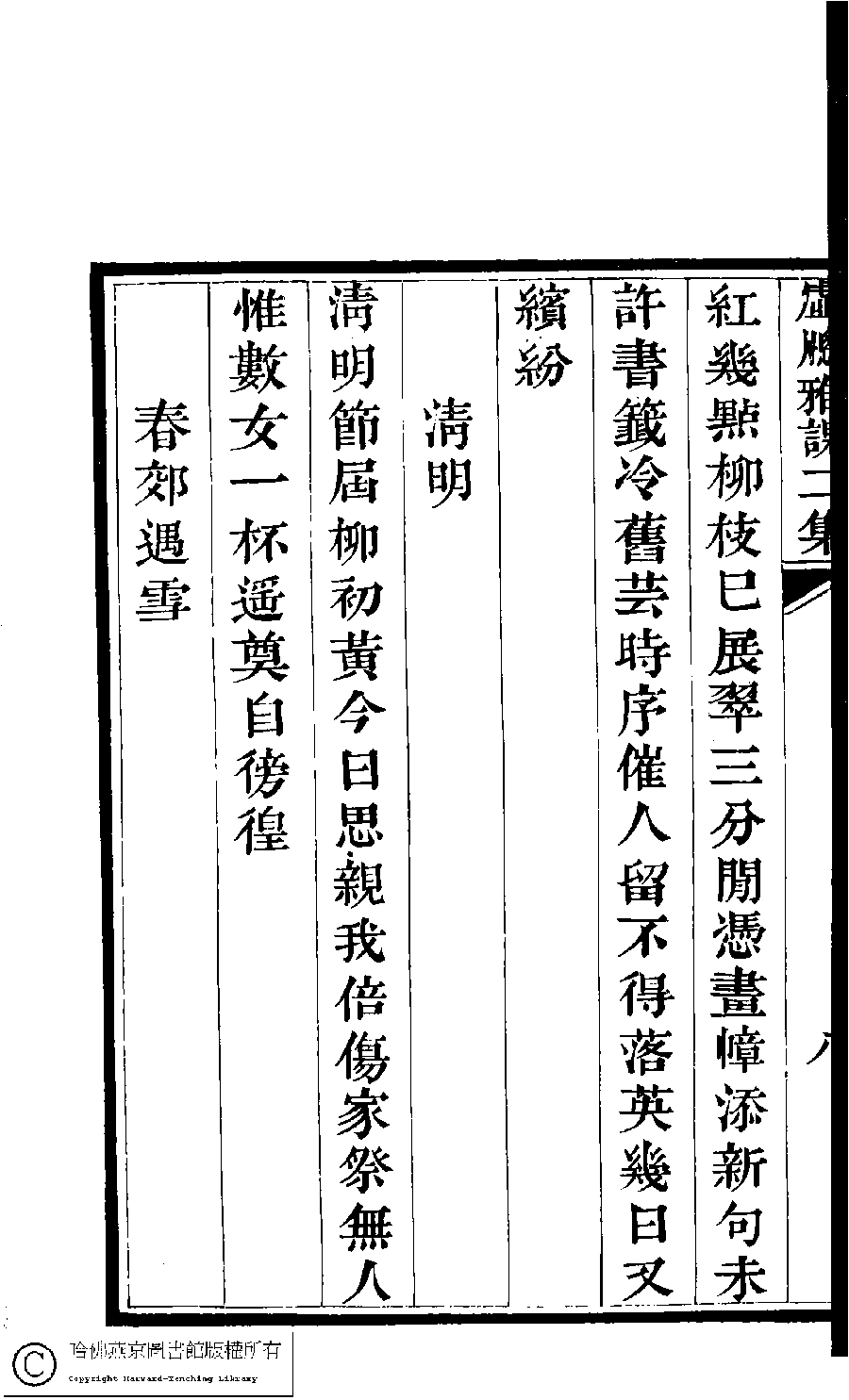 | (PRINT FRIENDLY VERSION) 虛窻雅課﹕二集(清佟佳氏撰)。清嘉慶十年(1805)刻本 ![]() 頁碼 : 2.9a | 点 击 放 大 | 虛窻雅課﹕二集(清佟佳氏撰)。清嘉慶十年(1805)刻本![]() 頁碼 : 2.8b | 点 击 放 大 | 返回 |